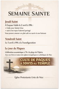 Nous célébrons le culte chaque dimanche à 10h15 au temple Saint-Esprit, 21 bd Victor Hugo, et chaque samedi à 18h à L’Espace Valdo, 278 avenue Sainte Marguerite
